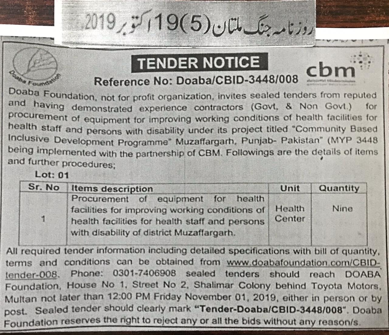 DF/IFT008-CBID 3448 MYP00On October 21, 2019October 29, 2019By Doaba FoundationIn TenderDownload = Procurement of equipment for health facilities