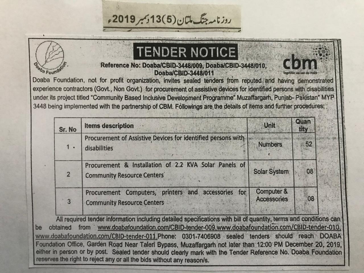 Tender 011 IFT Procurement of Computers & Acccessories for CRCs00On December 13, 2019December 18, 2019By Doaba FoundationIn TenderDownload File = Tender 011 IFT Procurement of Computers & Acccessories for CRCs